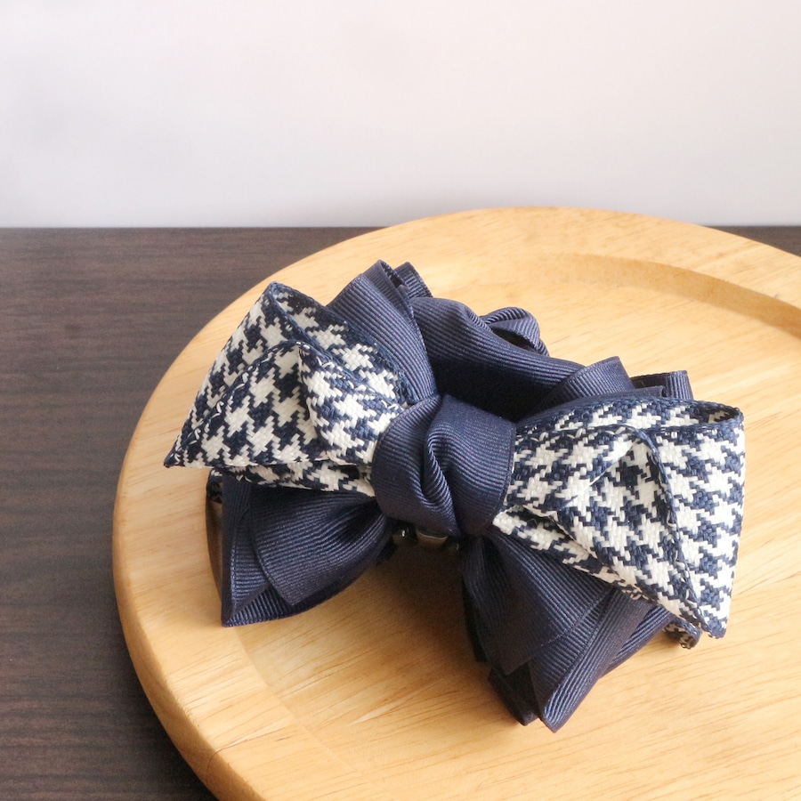 【選べる2サイズ】紺色千鳥格子リボンのバンスクリップ オフィス 通勤 フォーマル オフィスカジュアル ネイビー