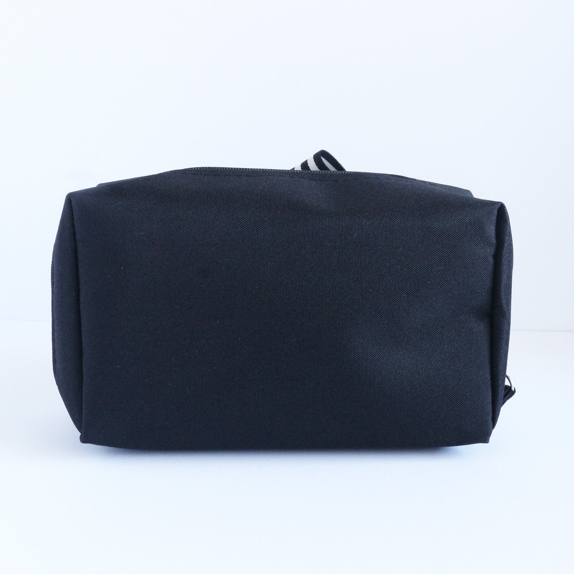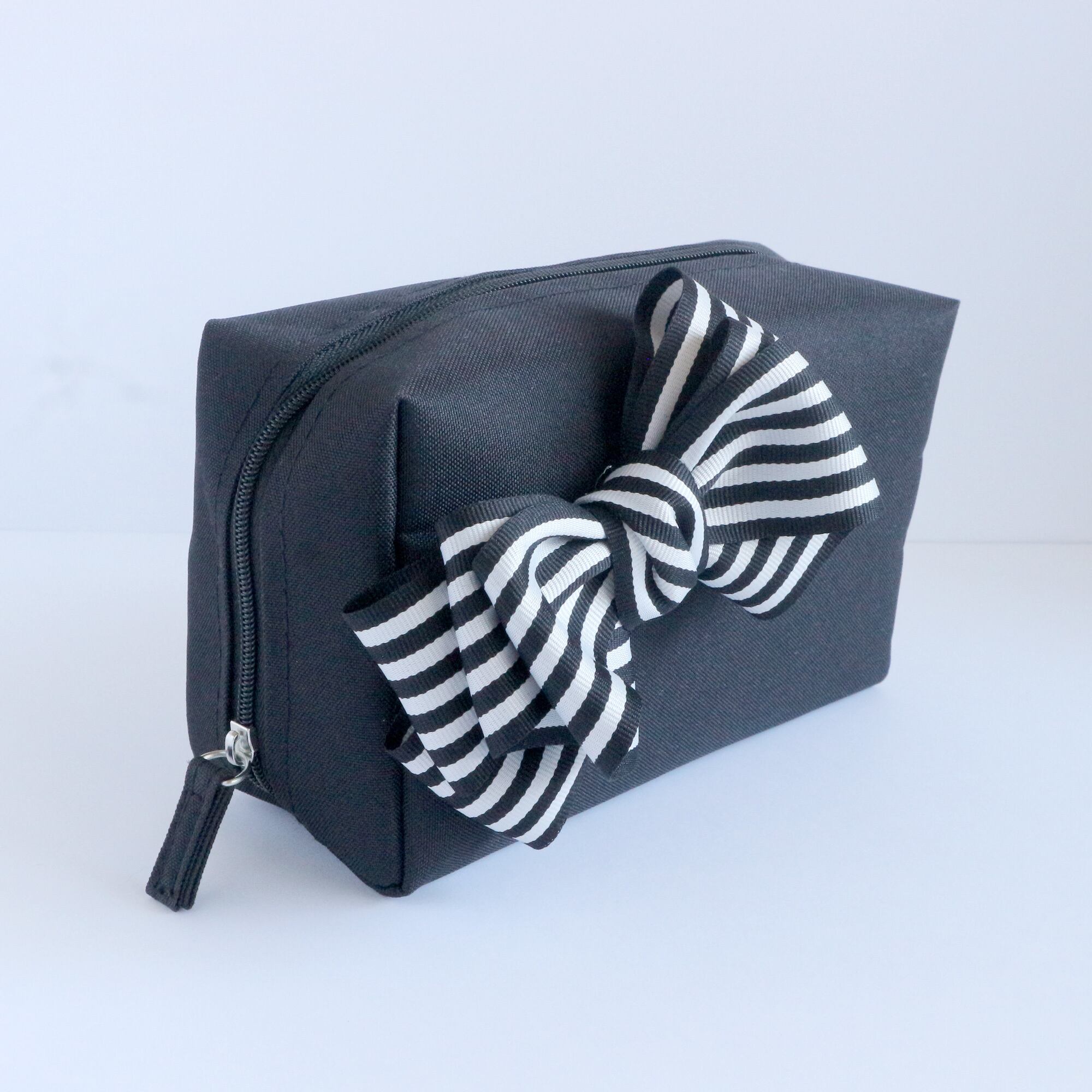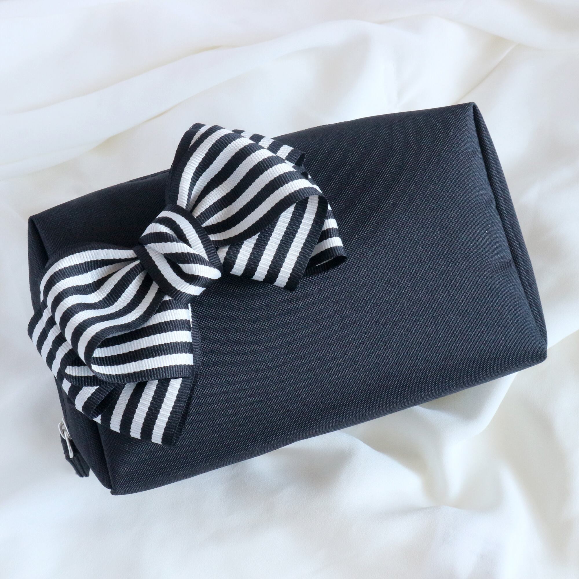 黒地に黒x白色ストライプリボンをあしらった、大人かわいいスクエア型の大容量ポーチです。