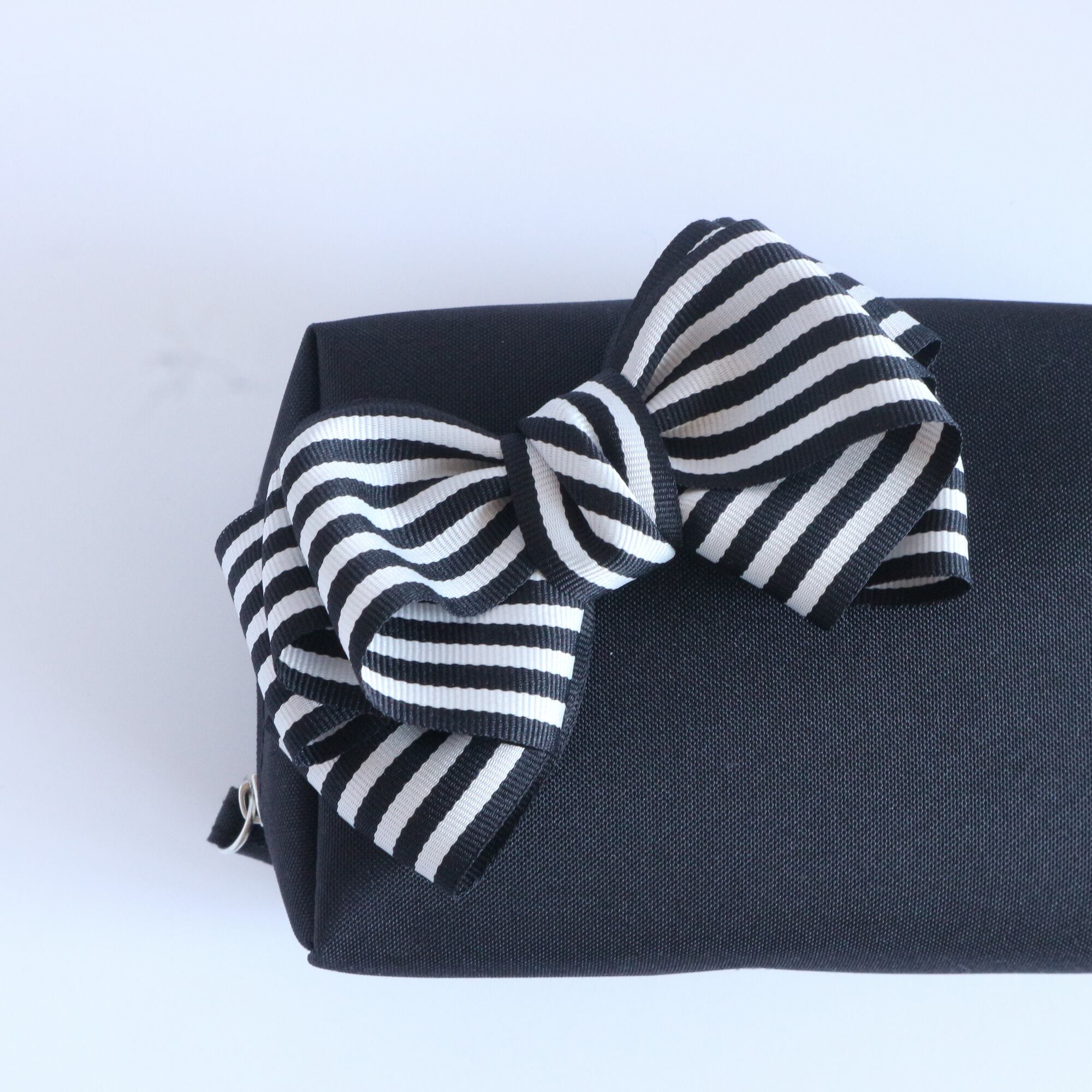 ストライプのグログランリボンは、シンプルな黒の生地と相性抜群。甘すぎず、大人の持ち物としても品よくなじみます。