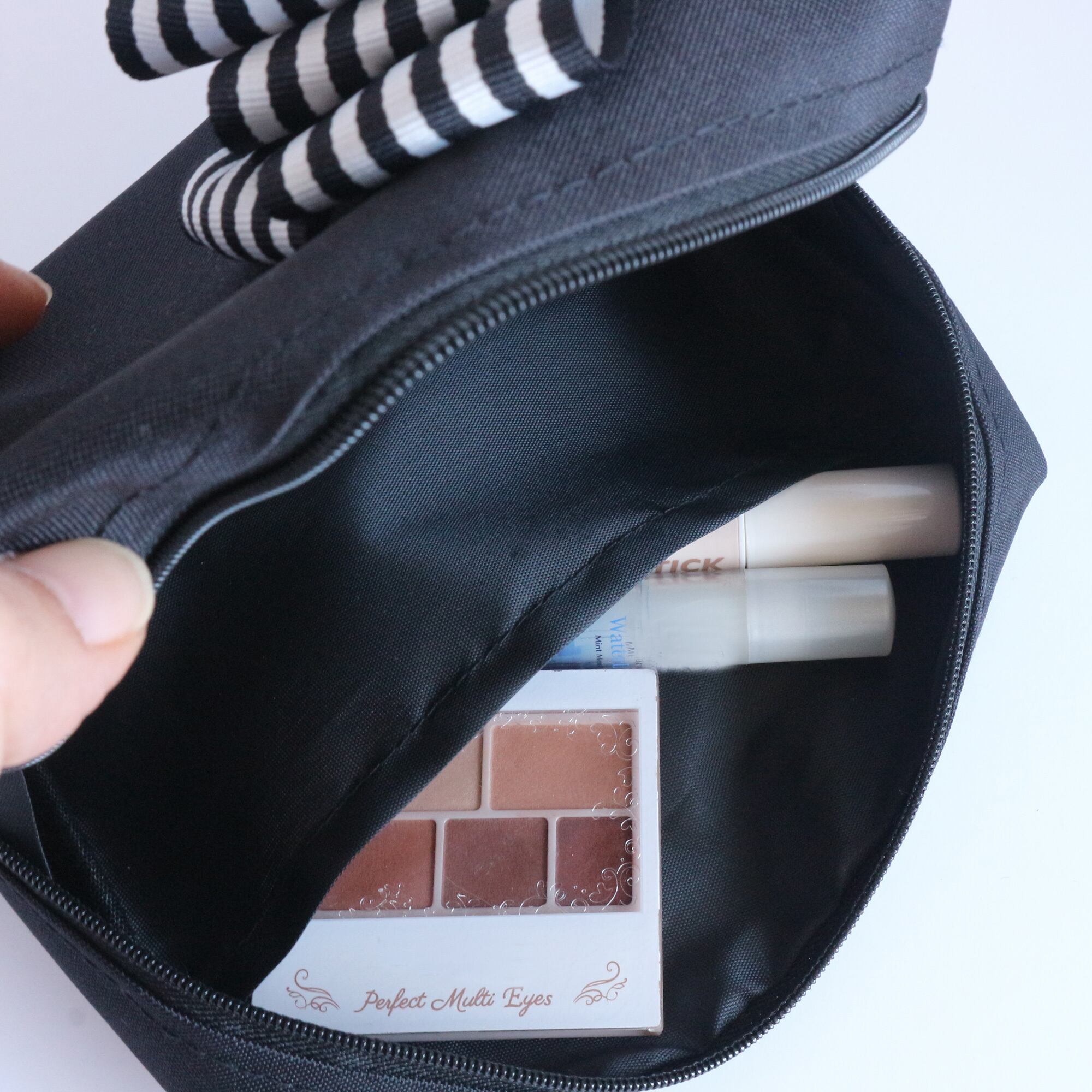 【選べる3色】黒×白ストライプリボンの大容量スクエアポーチ 仕切り付き・化粧ポーチ ガジェット収納 大きめ プレゼント