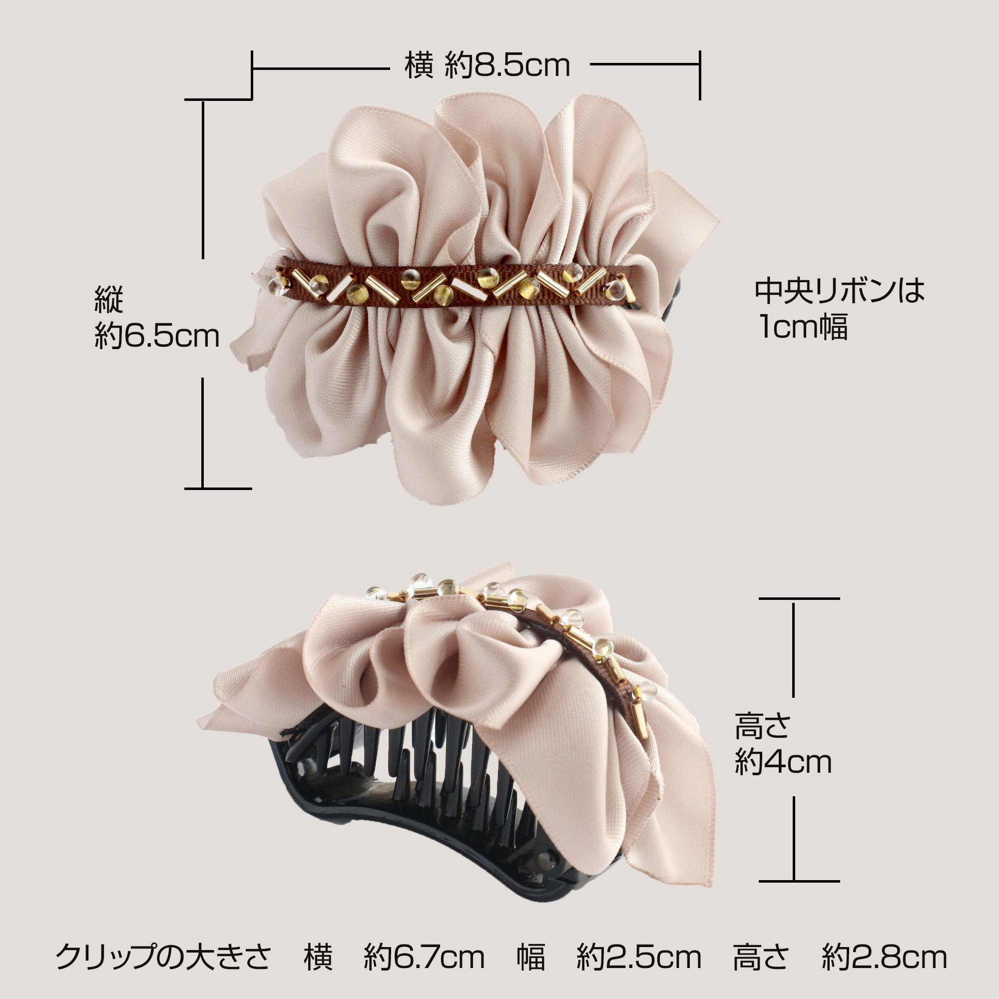大人可愛いサテンリボンアーチ型バナナクリップ(ベージュ)ビーズ 刺繍 くすみベージュ春 プレゼント 通勤