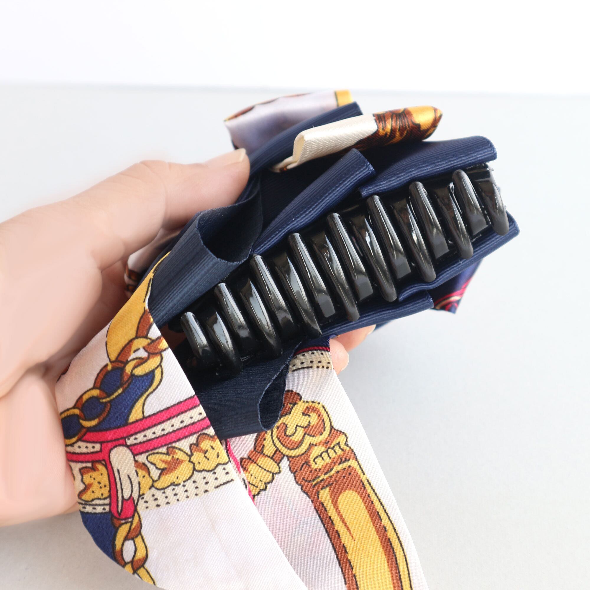 ゴールドのチェーン柄 スカーフリボンのバンスクリップ(紺) ギフト ヘアクリップ 秋 冬 大人可愛い 大きめ