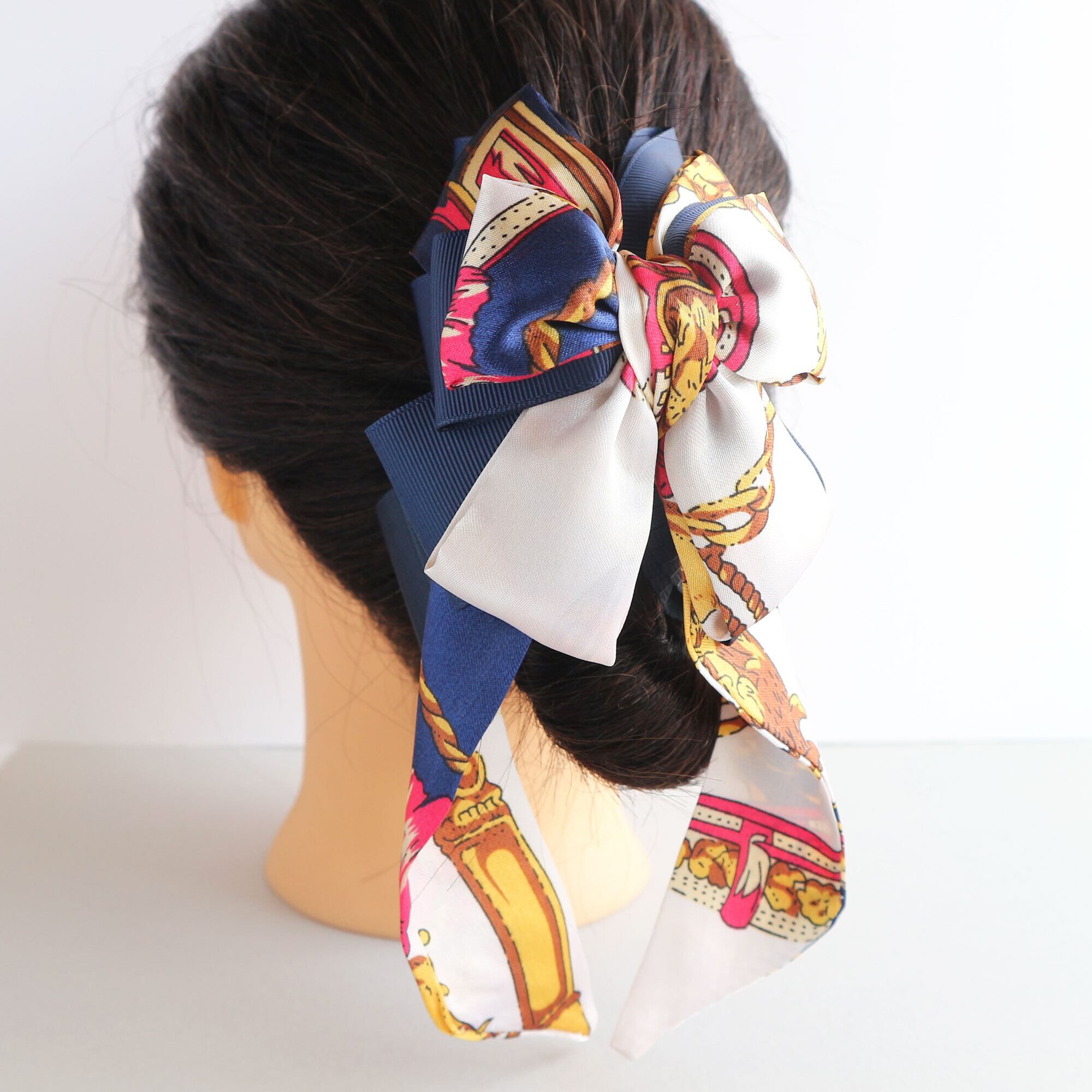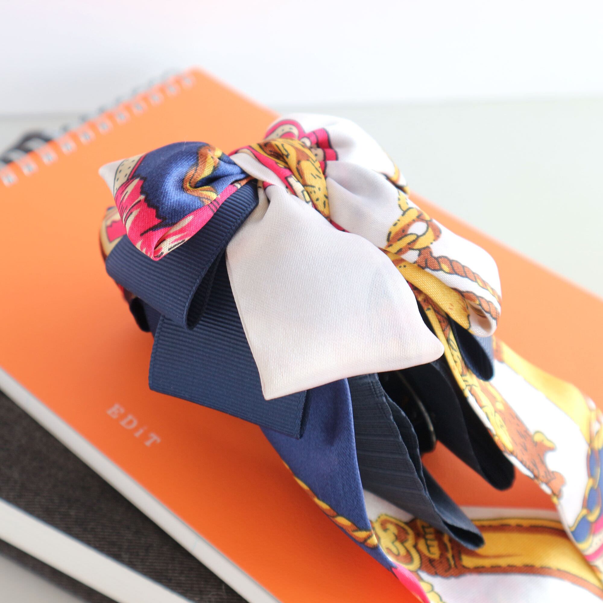 そんな誰かの顔がふと浮かぶような、上品で華やかなスカーフリボンの大きめバンスクリップです。