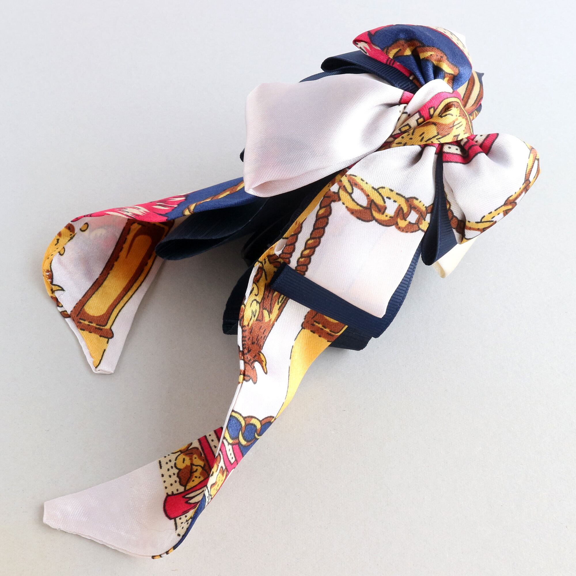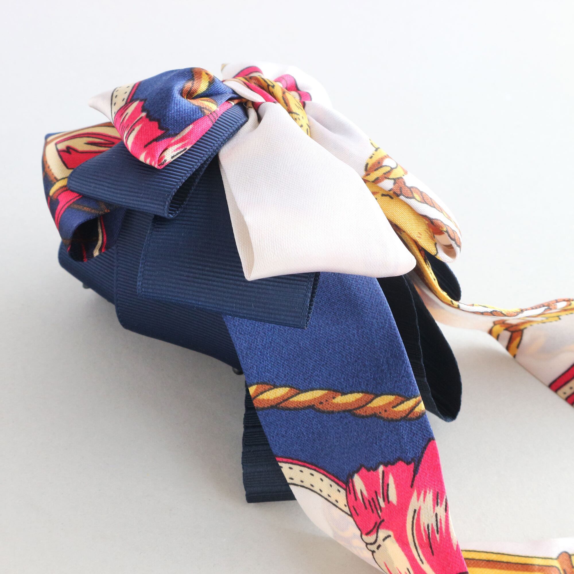 *こちらの商品で使用しているスカーフ柄リボンは、切り出す部分によって柄の出方が異なります。ご了承ください。