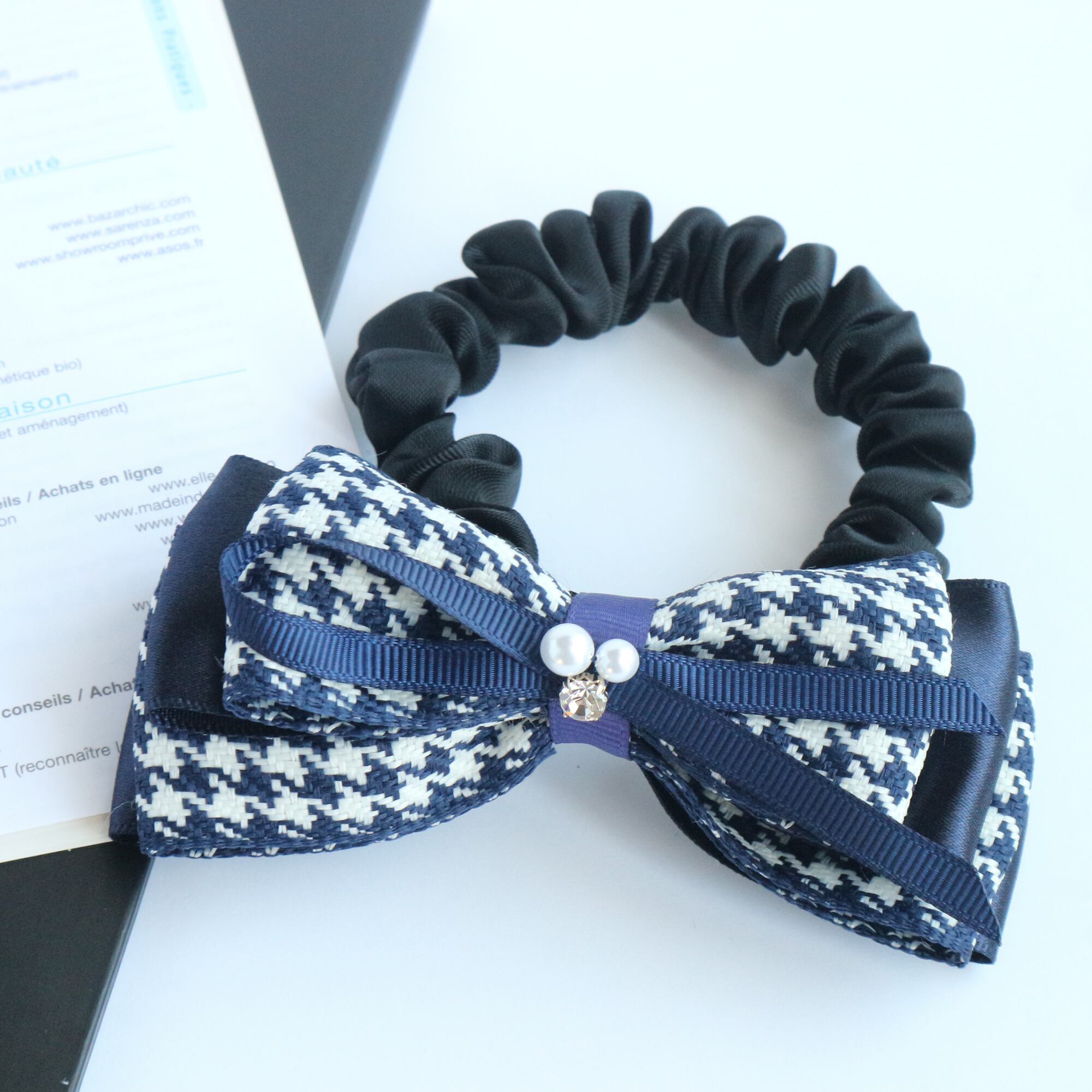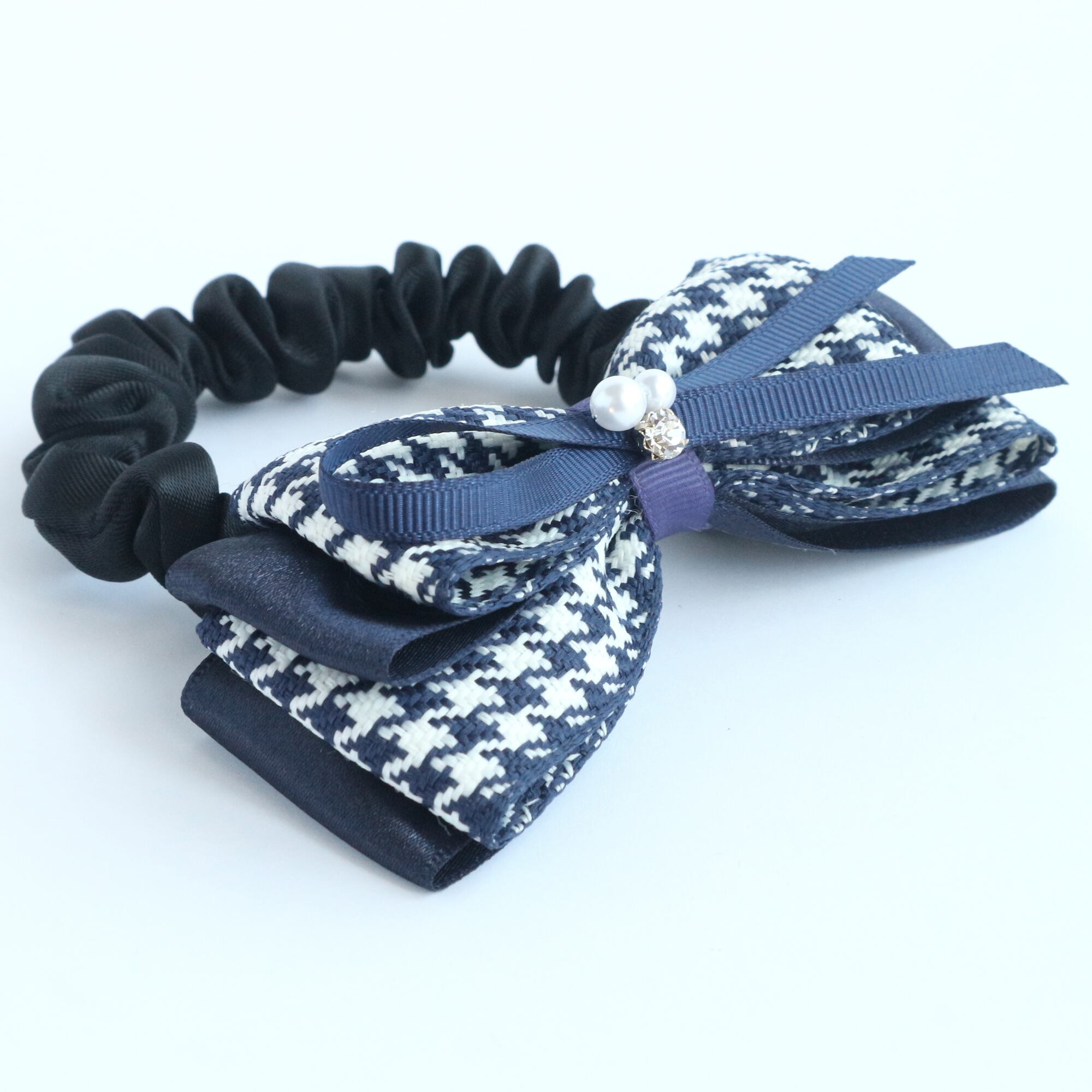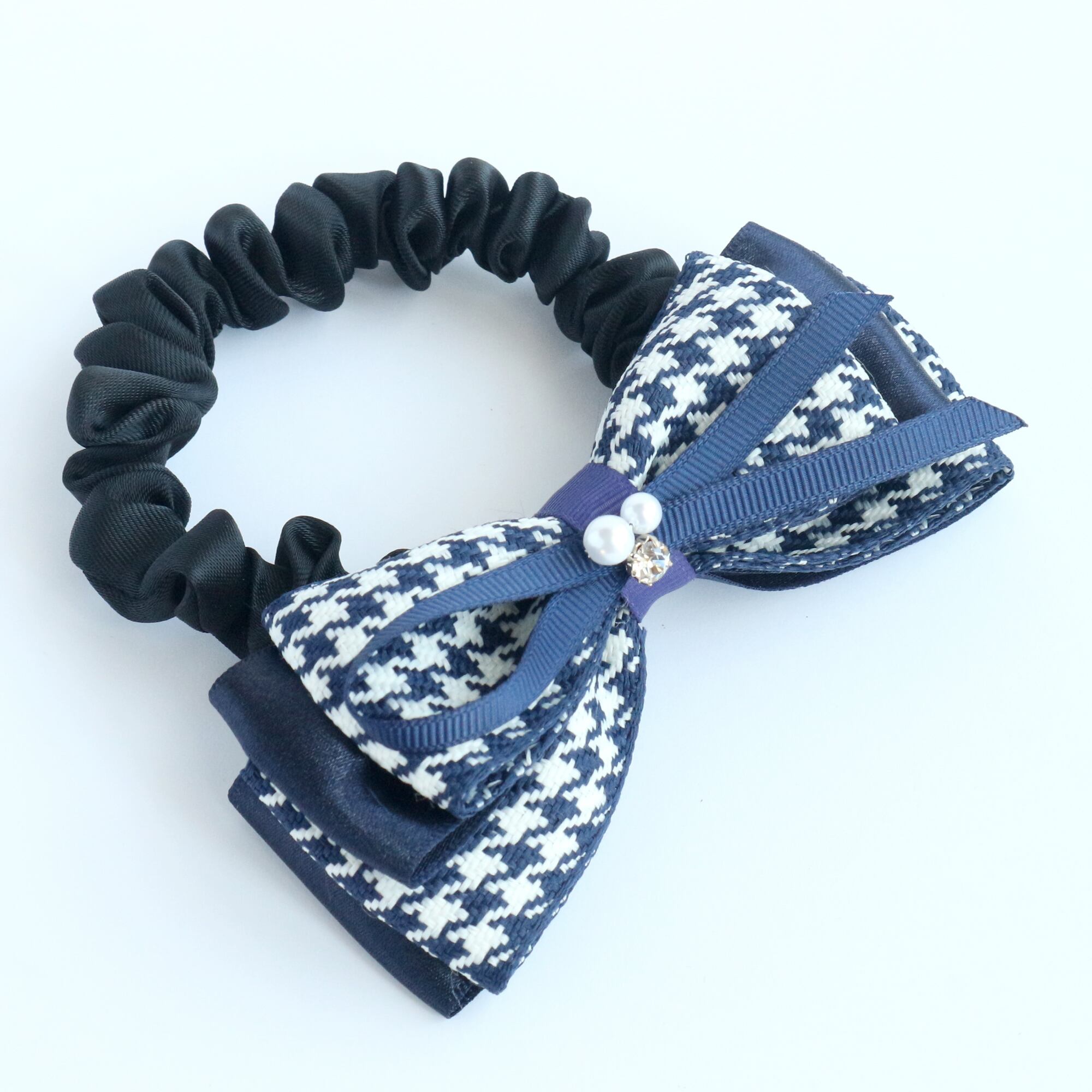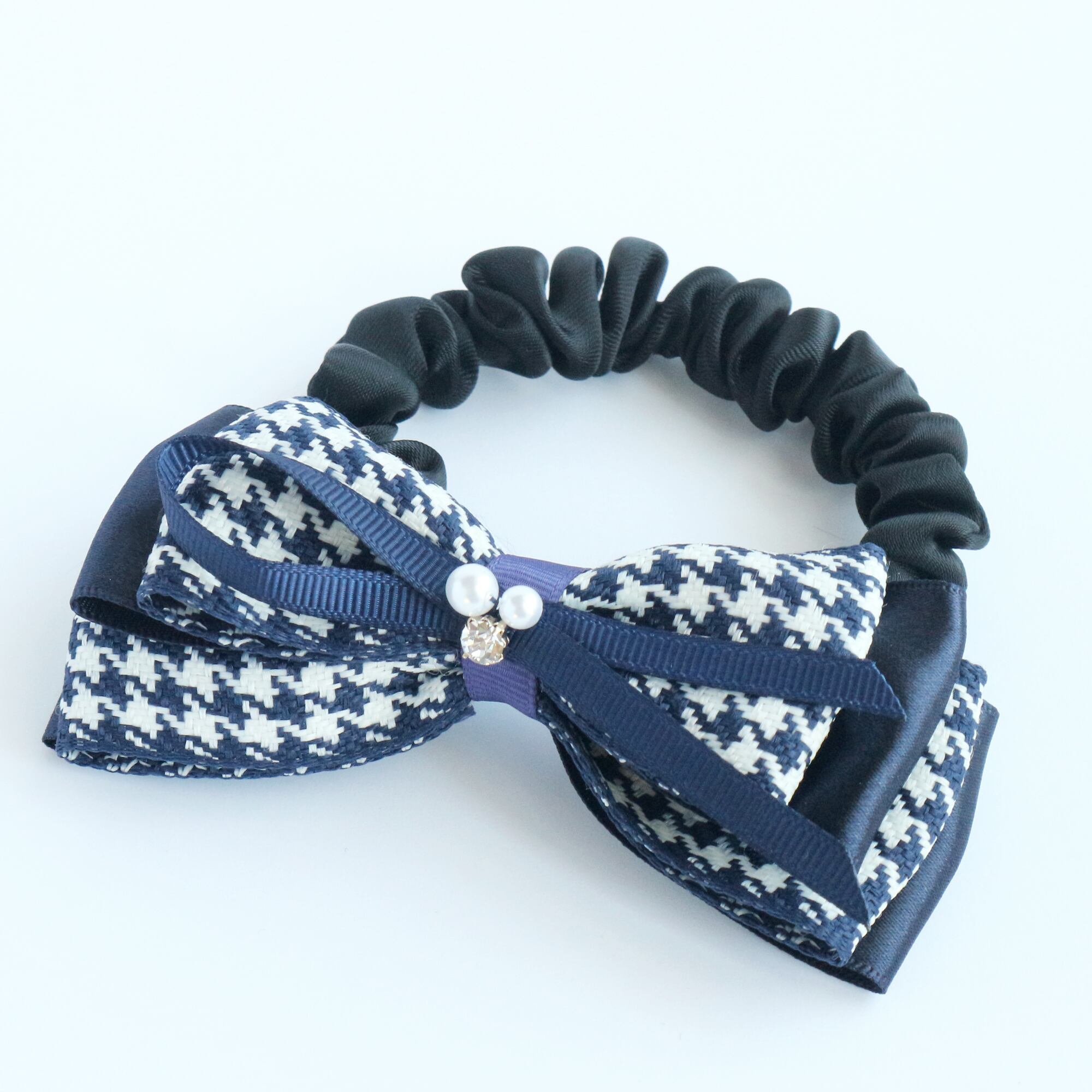 千鳥格子リボン シュシュ紺 上品 クラシカル フォーマル 卒業式 入学式 冬 春 通勤 通学 ギフト