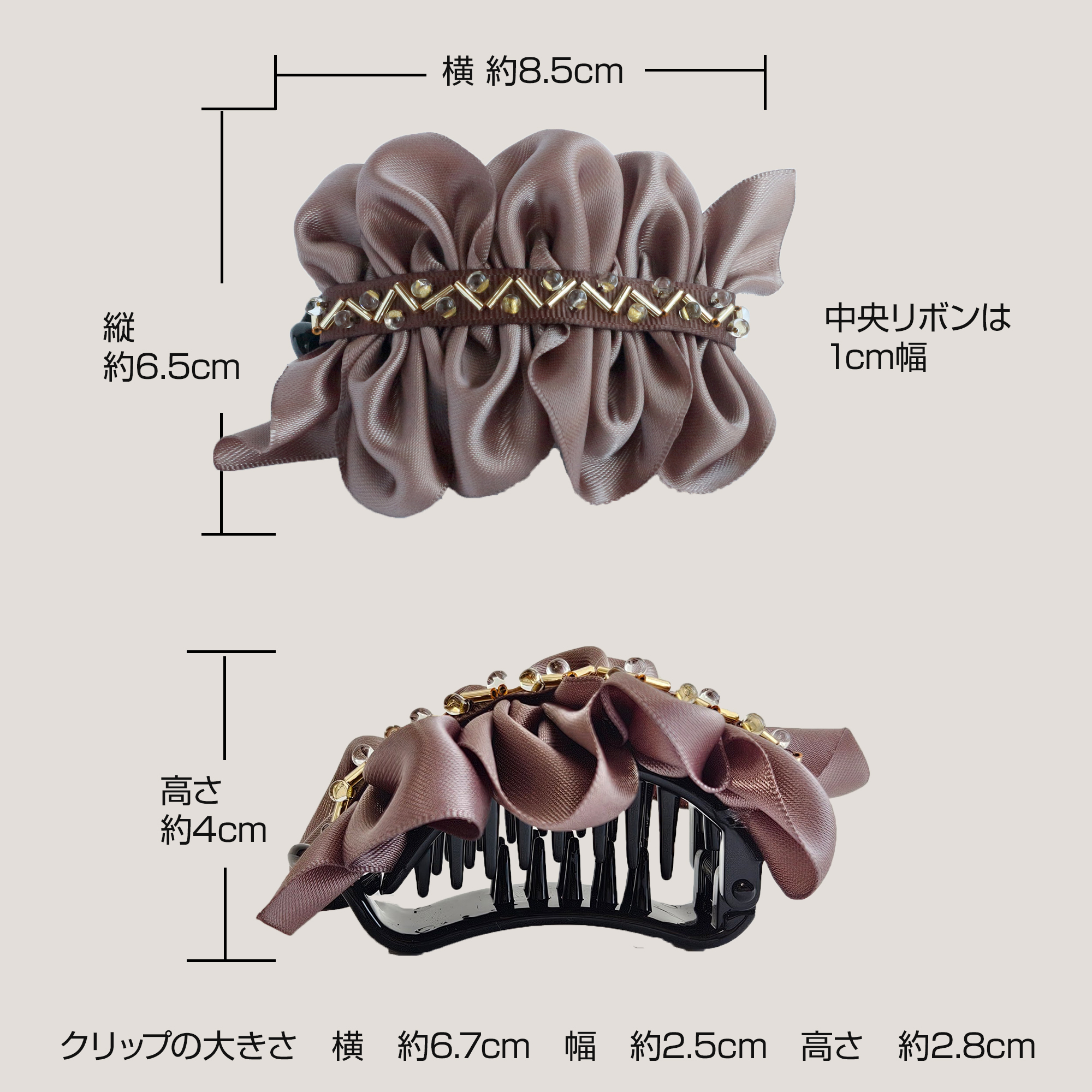大人可愛いサテンリボンアーチ型バナナクリップ(ベージュ)上品 ビーズ 刺繍 まとめ髪 春 秋 冬