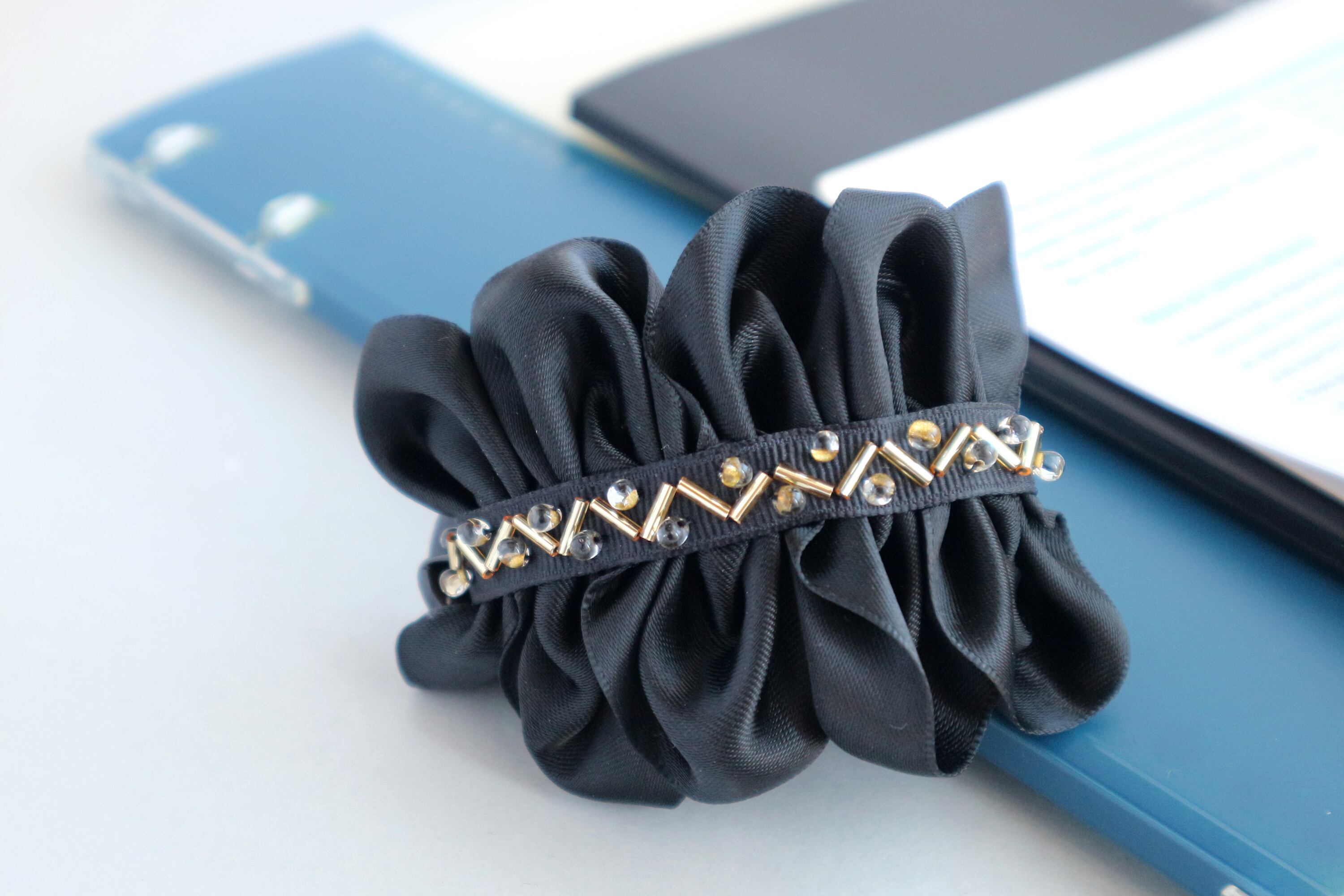 大人可愛いアーチ型バンスクリップ リボン×ビーズ×ブラックで上品なまとめ髪にぴったり 黒 プレゼント 秋 冬