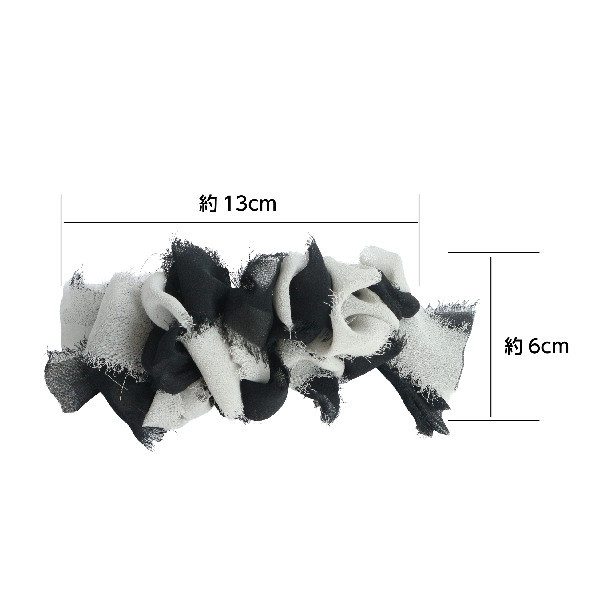 透け感のあるシフォンリボンをたっぷり使い、ふんわりと仕上げた2色づかいのバレッタです。リボンの端にフリンジ加工で、かっちりしすぎない大人の遊び心がプラスされます。