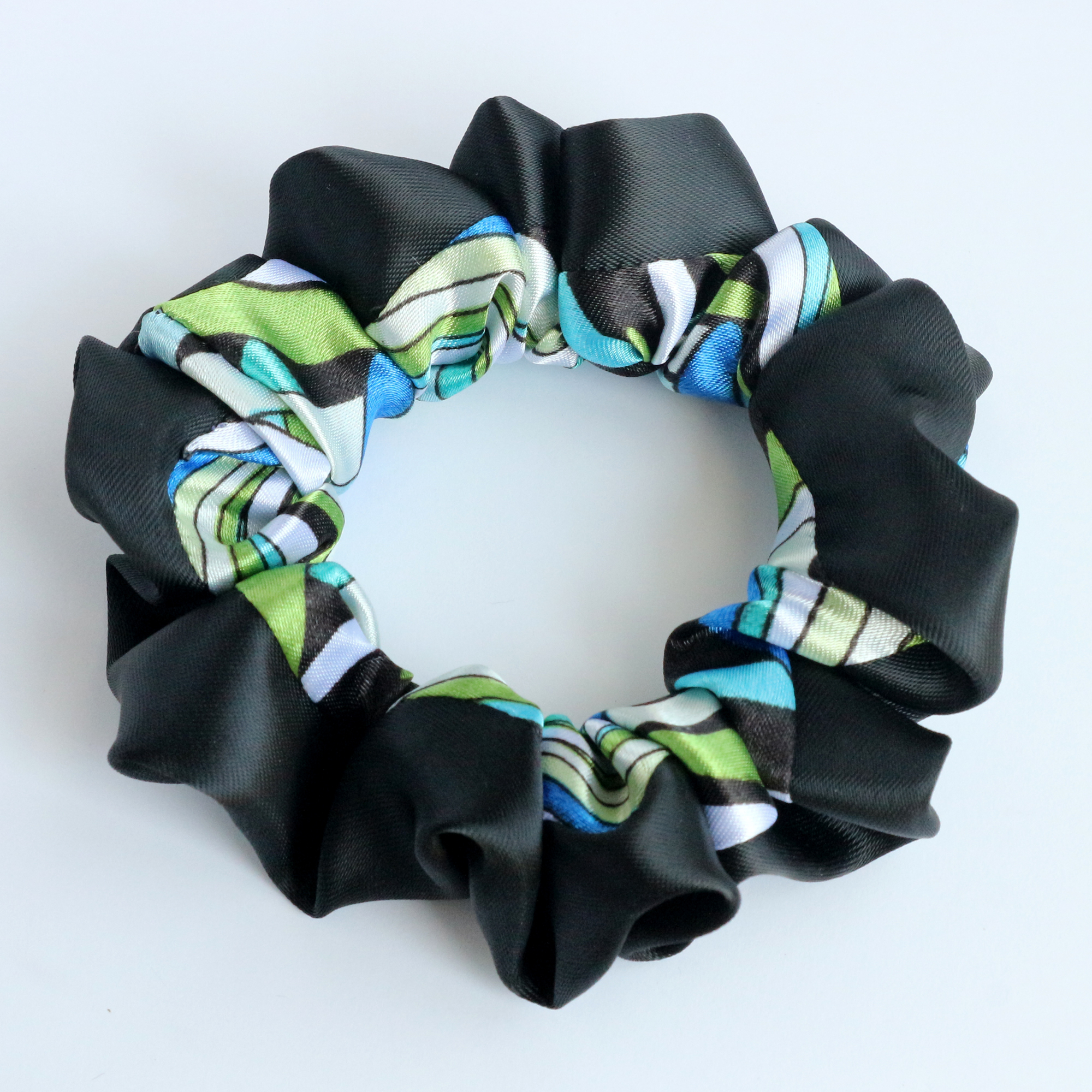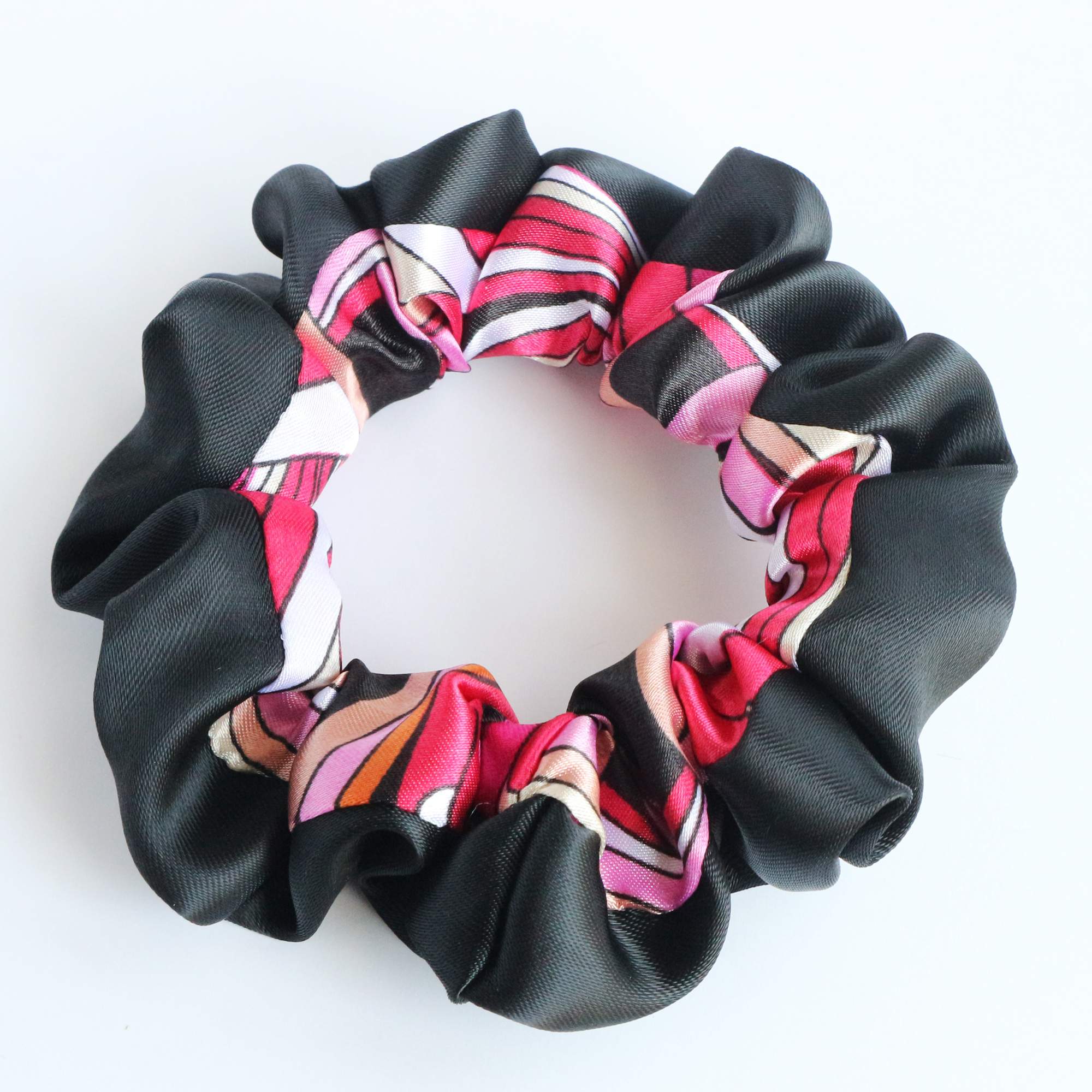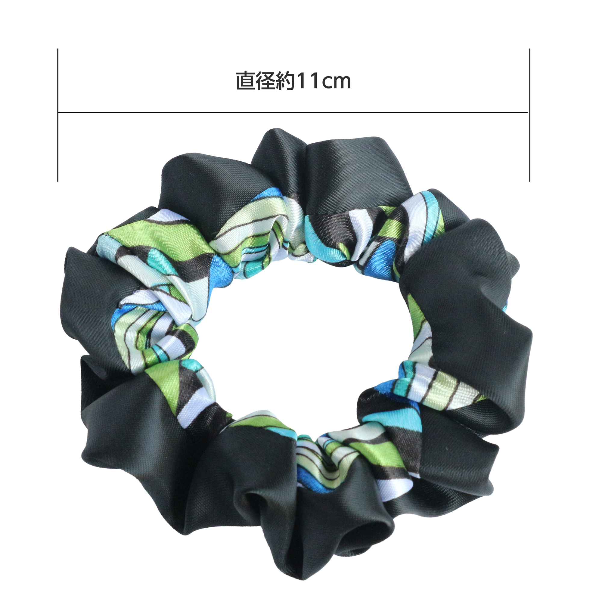 【柄と無地のコンビ柄】スカーフ柄シュシュ ピンク ブルー 黒 大人 梅雨 まとめ髪 母の日 通勤 通学 ギフト プレゼント