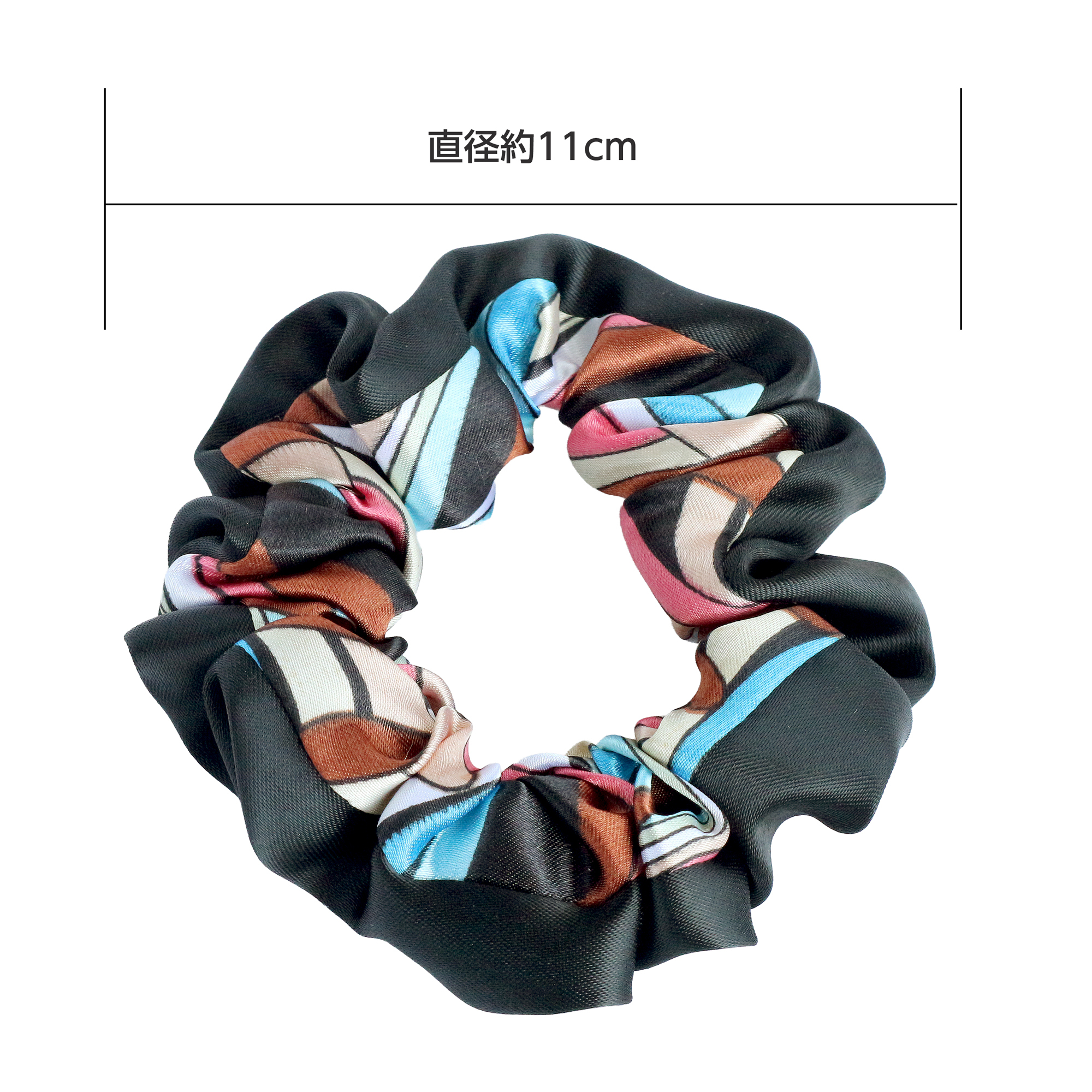 【柄と無地のコンビ柄】スカーフ柄シュシュ カラフル 黒 大人 梅雨 まとめ髪 母の日 通勤 通学 ギフト プレゼント