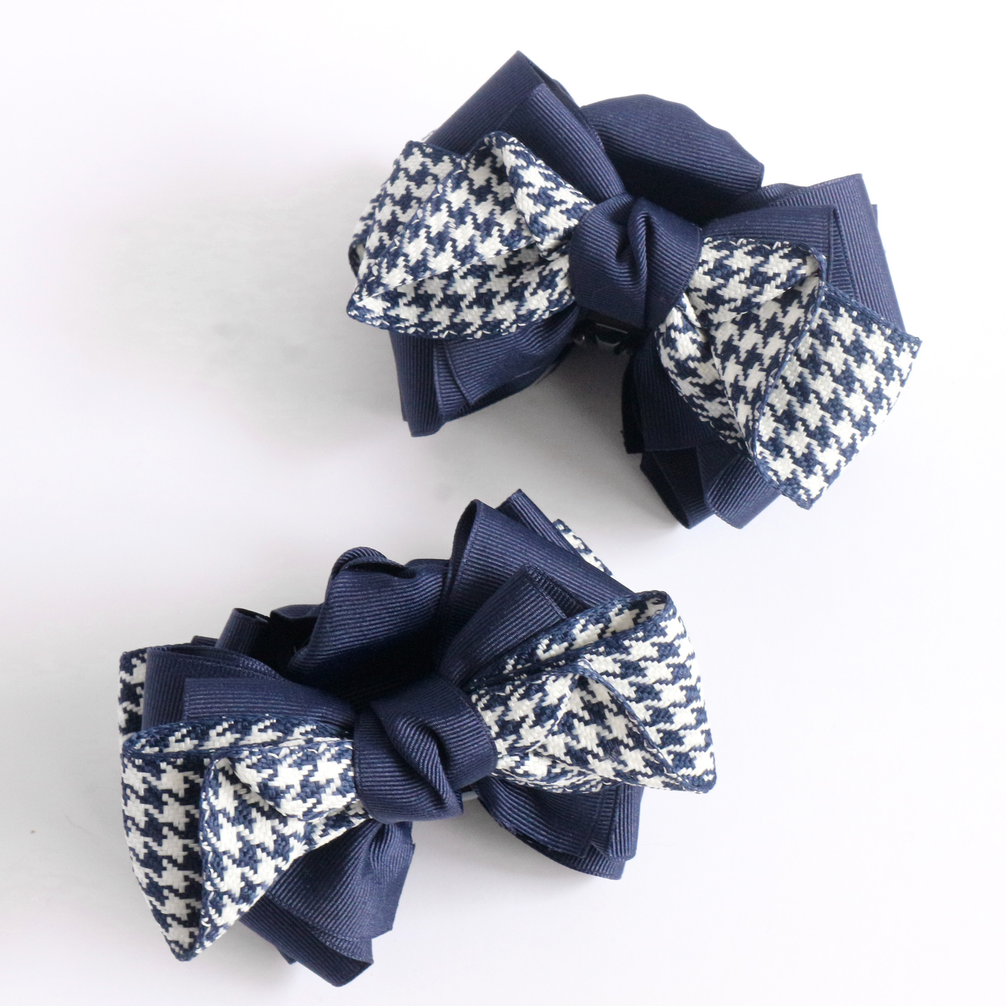 <紺色 千鳥格子リボンのバレッタ>