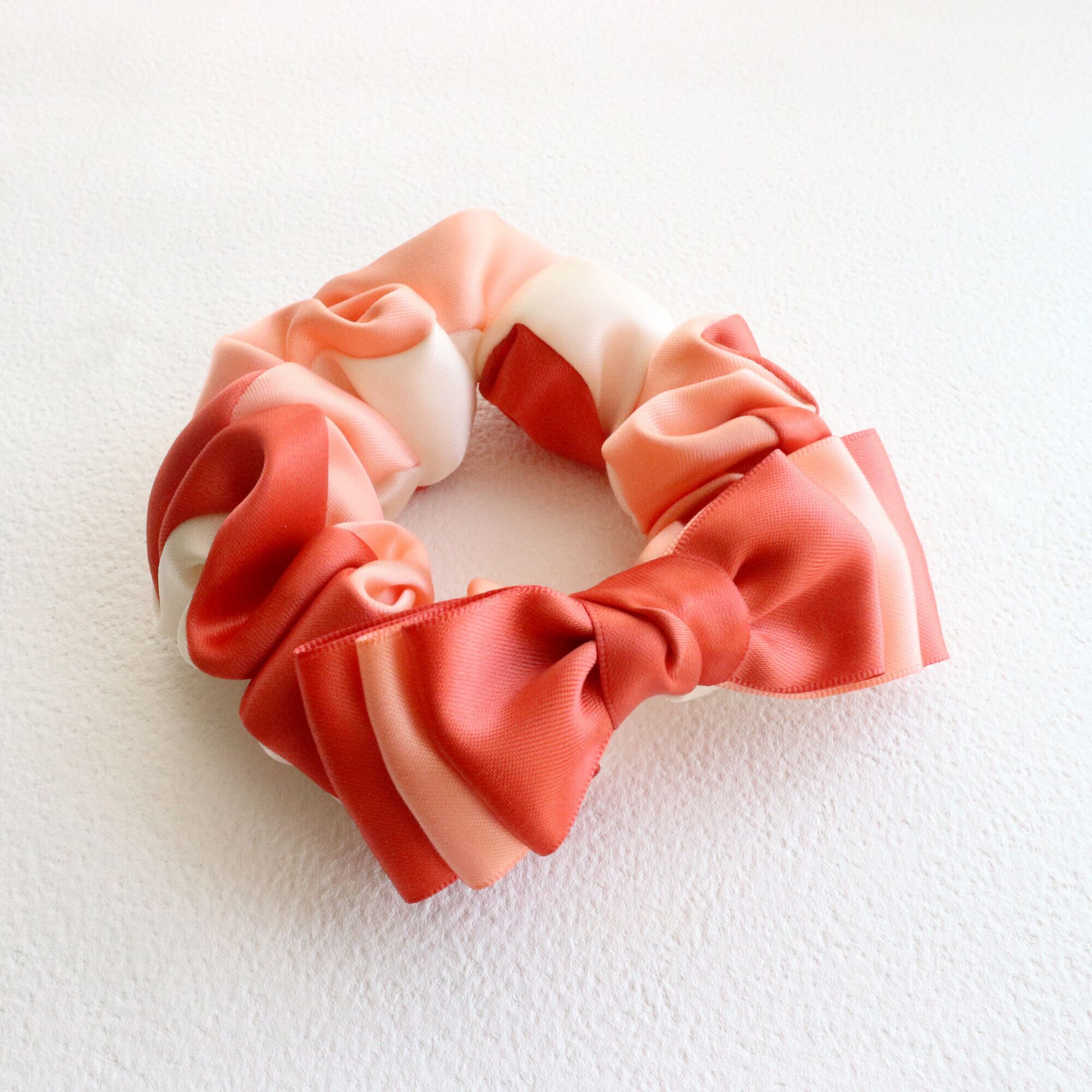 ふんわりとしたサテンリボンが可愛らしい、3色カラー サテンリボンのシュシュ。