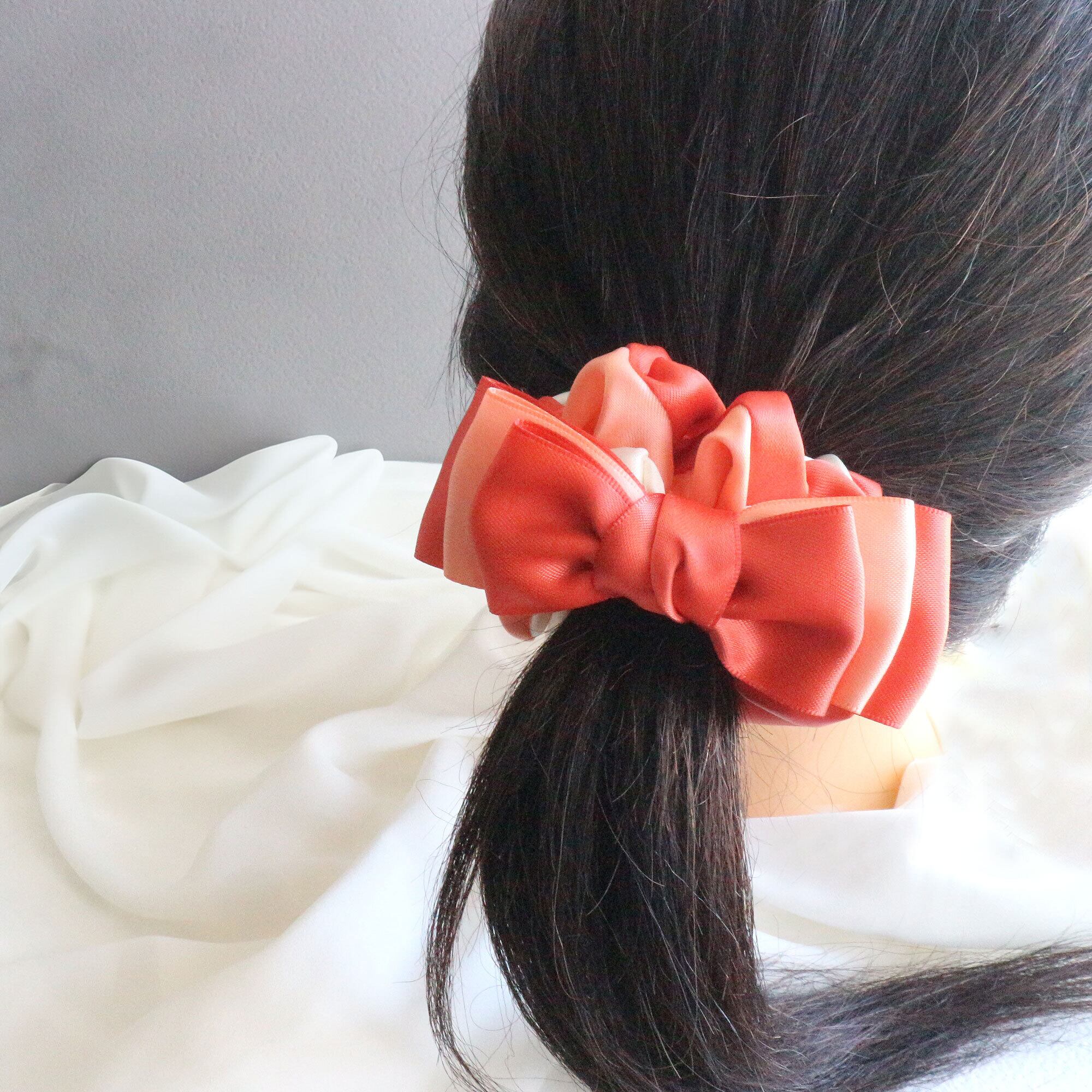 可愛い3色カラー サテンリボンの シュシュ オレンジ系(マンダリンオレンジ アイボリー ピーチオレンジ) 女性 大人 プレゼント ギフト