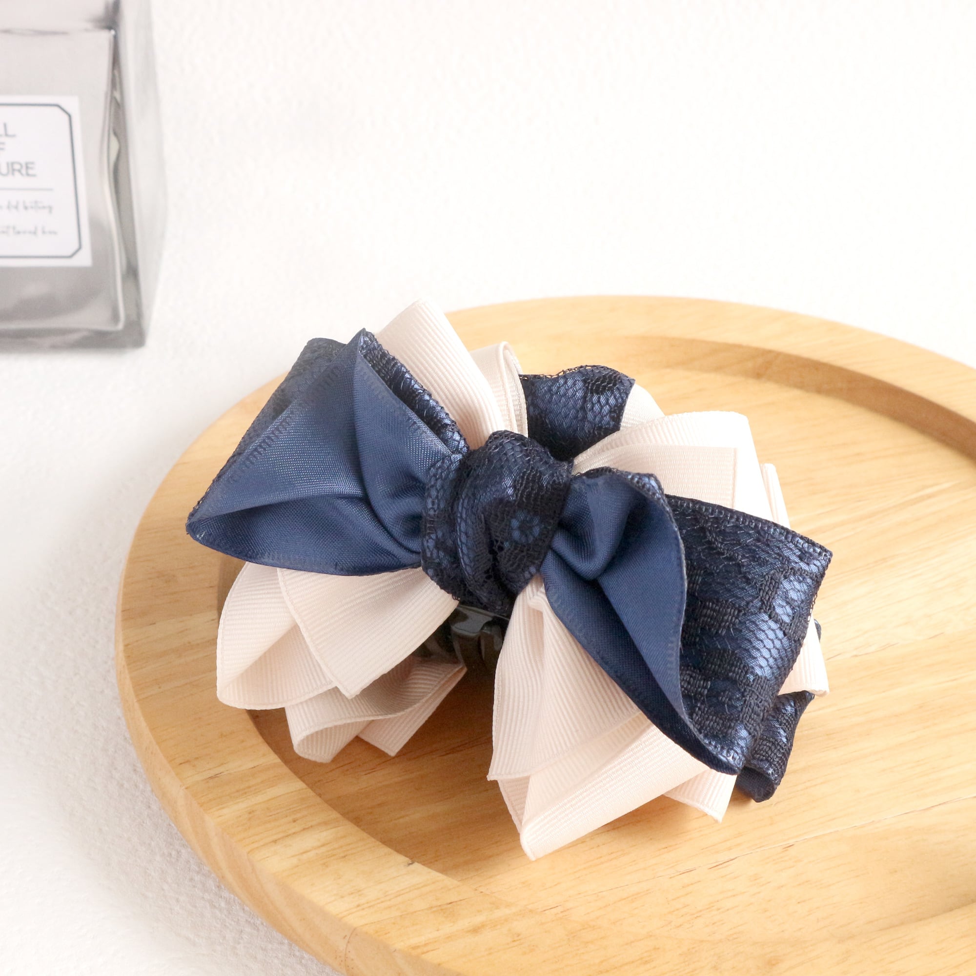 ちょっと甘めテイストの中にきちんと感があり、オフィスカジュアルな服装に合わせやすいレースリボンを使ったバンスクリップです。
