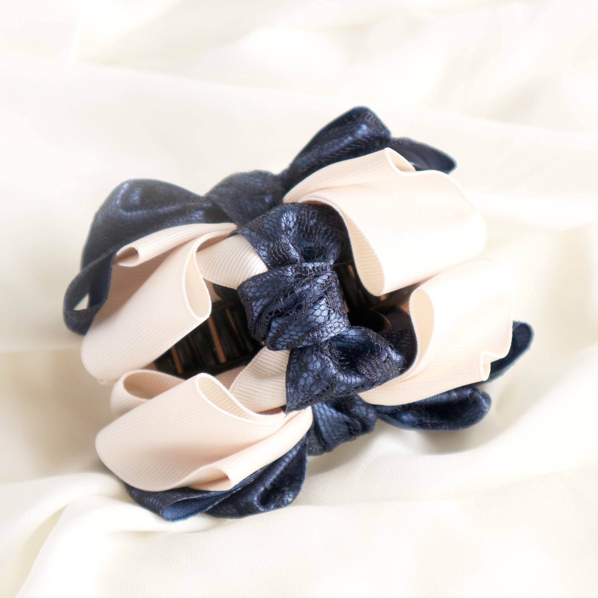 【選べる2サイズ】シック&甘め レースリボン バンスクリップ 小ぶり オフホワイト 紺 大きめ 入学式 卒業式 オフホワイト 大人可愛い 通勤 通学